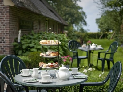Dagelijks mogelijk in de lounge of op ons terras! Uitgebreide high tea met 2 hartige snacks, bakkerskoekjes, bon bons en huisgemaakte zoetigheden, mini gebak, échte Engelse muffins en scones, vers geslagen room en marmelades. (Luxe High tea € 21,- pp | Afternoon tea € 17,50 pp. Deelname min.6 pers.)